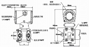 例:TDSB3051差壓變送器,量程0-300kpa,兩線制4~20 mA DC信號輸出,法蘭接頭、排氣/排液閥隔離膜片均為316不銹鋼,智能表顯示器管裝平支架,泄放閥在壓力室側(cè)面的橢圓接頭內(nèi)螺紋NPT 1/2