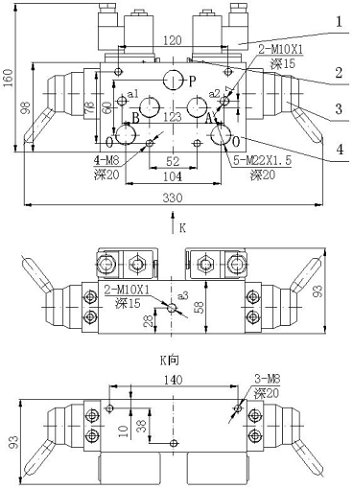 O---通往排氣口,&nb, sp; K向圖中的140(以中心線各70mm、38的三個(gè)孔均為安裝固定的M8螺絲孔.