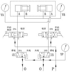 、當(dāng)制動(dòng)電磁閥(正面左)通電,復(fù)歸電磁閥(正面右)不通電;壓力氣從P腔進(jìn)入電磁閥到手動(dòng)轉(zhuǎn)閥至工作腔A,工作腔B通向O實(shí)現(xiàn)自動(dòng)制動(dòng);制動(dòng)電磁閥失電,制動(dòng)腔氣體從0腔排出