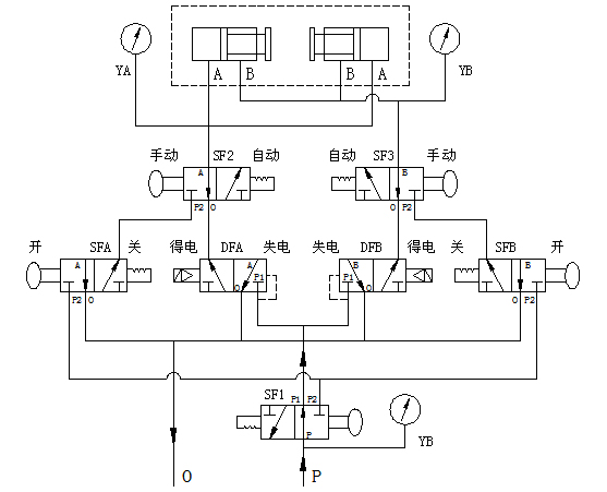 自動(dòng)剎車:電磁閥線圈處于失電狀態(tài),手拉閥SF1、SF2、SF3往里推至自動(dòng)狀態(tài),過濾后壓縮氣體從進(jìn)氣腔(P腔)進(jìn)入集成塊。當(dāng)接收到停機(jī)指令時(shí),制動(dòng)電磁閥DFA得電開閥,使壓縮氣體進(jìn)入制動(dòng)腔(A腔), 從而實(shí)現(xiàn)對(duì)制動(dòng)器的投入, 加速機(jī)組的制動(dòng)停機(jī);